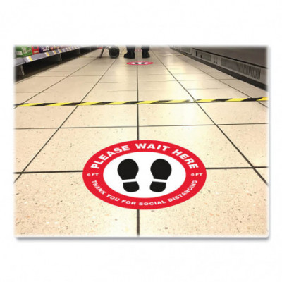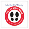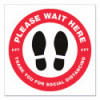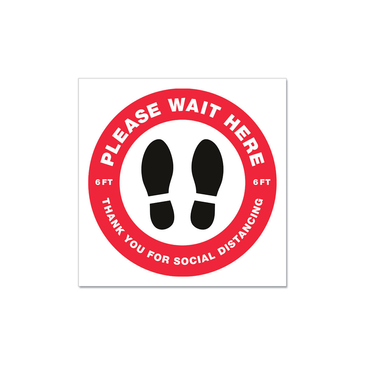 Social Distancing Floor Decals, 10.5" dia, Please Wait Here, Red/White Face, Black Graphics, 5/Pack
