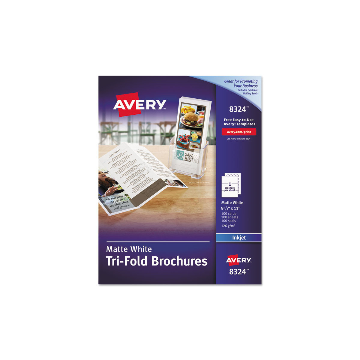 Create brochures, flyers, announcements, newsletters, menus and more. High-quality soft gloss or matte paper for sharp text and brilliant colors. Pre-scored for easy folding. Mailing seals included. Brochures with Tear-Away cards are great for generating repeat customers. Each sheet features detachable cards that may be printed for use as business cards, coupons or promotional offers. Smooth, non-perforated edges. Printable on both sides. Easy to customize using free Avery® design tools, QR codes and templates.