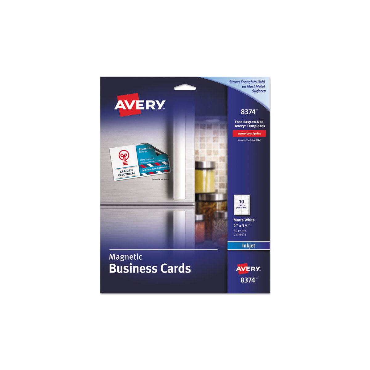 Print magnetic business cards. Pre-cut to allow for easy separation. Matte coated for sharp text and vivid color. Strong enough to hold on most metal surfaces. Easy to customize with free designs and templates from Avery Design & Print. 8.5" x 11" for inkjet printers.