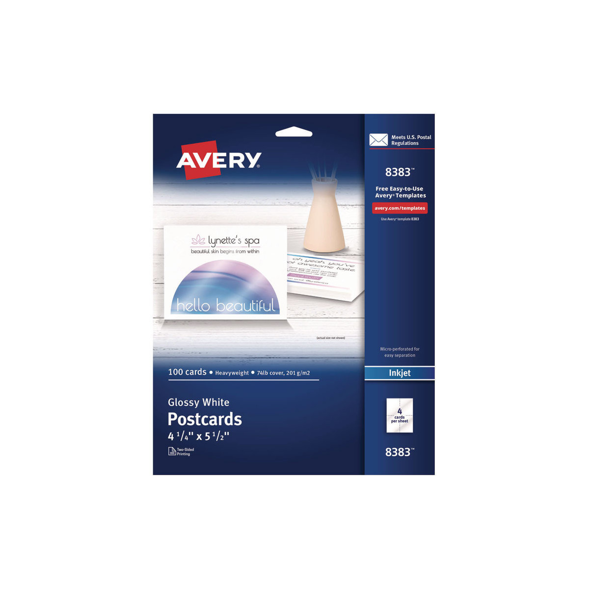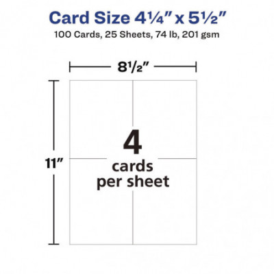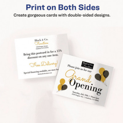 Create professional-looking invitations, announcements, reminders, seasonal offers and more. Sturdy bright white cardstock is either matte-coated for vivid graphics and sharp text or has a premium quality glossy finish ideal for photos. Ultra-fine perforations let you separate cards cleanly and easily. Meets U.S. postal regulations for postcards. Easy to customize with free templates and designs using Avery Design & Print Online. 8.5" x 11" sheets.