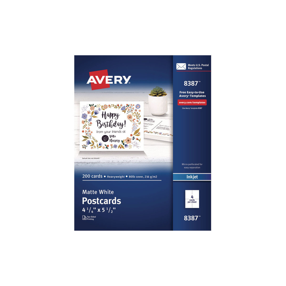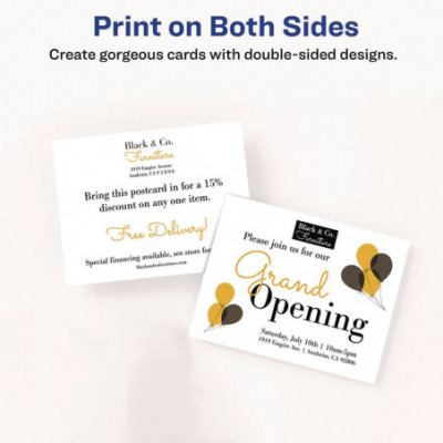Create professional-looking invitations, announcements, reminders, seasonal offers and more. Sturdy bright white cardstock is either matte-coated for vivid graphics and sharp text or has a premium quality glossy finish ideal for photos. Ultra-fine perforations let you separate cards cleanly and easily. Meets U.S. postal regulations for postcards. Easy to customize with free templates and designs using Avery Design & Print Online. 8.5" x 11" sheets.