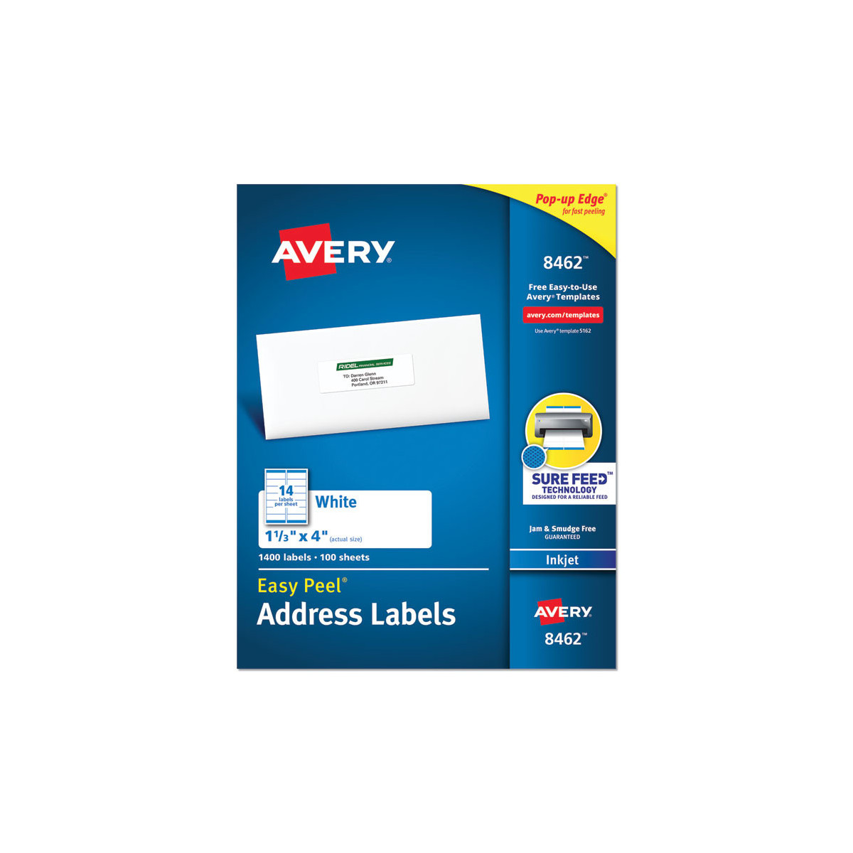 Easy Peel White Address Labels w/ Sure Feed Technology, Inkjet Printers, 1.33 x 4, White, 14/Sheet, 100 Sheets/Box