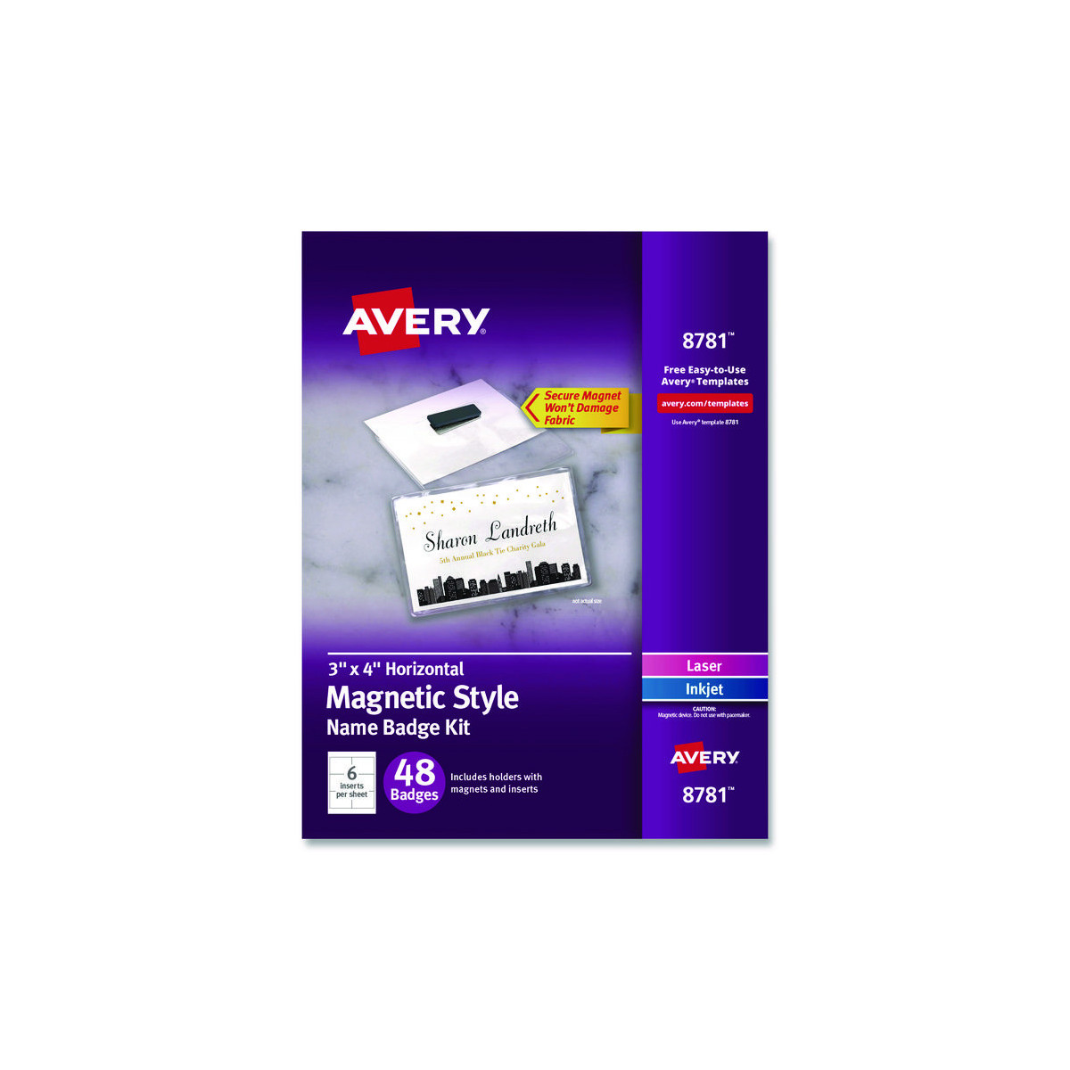 Strong magnet holds badge in place and will not damage material. Durable plastic with easy-to-load pocket is reusable and displays names clearly. Micro-perforated inserts separate cleanly. Customize using Avery® Design & Print. 8.5 x 11 sheets for laser and inkjet printers.