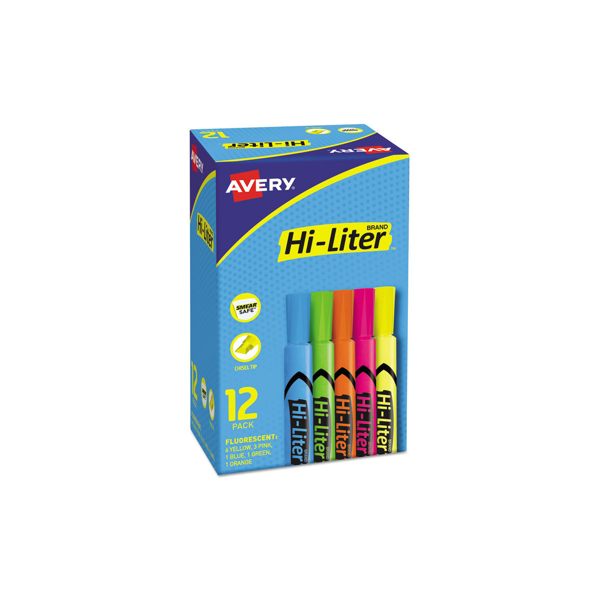 Study research materials, prepare documents or call attention to important information with Avery® HI-LITER Desk-Style Highlighters. Smear Safe, quick-drying ink provides reliable smear protection across most pen, marker and inkjet inks. Durable, fray-proof chisel tip accommodates both highlighting and underlining, while ensuring smooth performance. Nontoxic, low-odor ink is ideal for classrooms, offices and the home.
