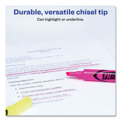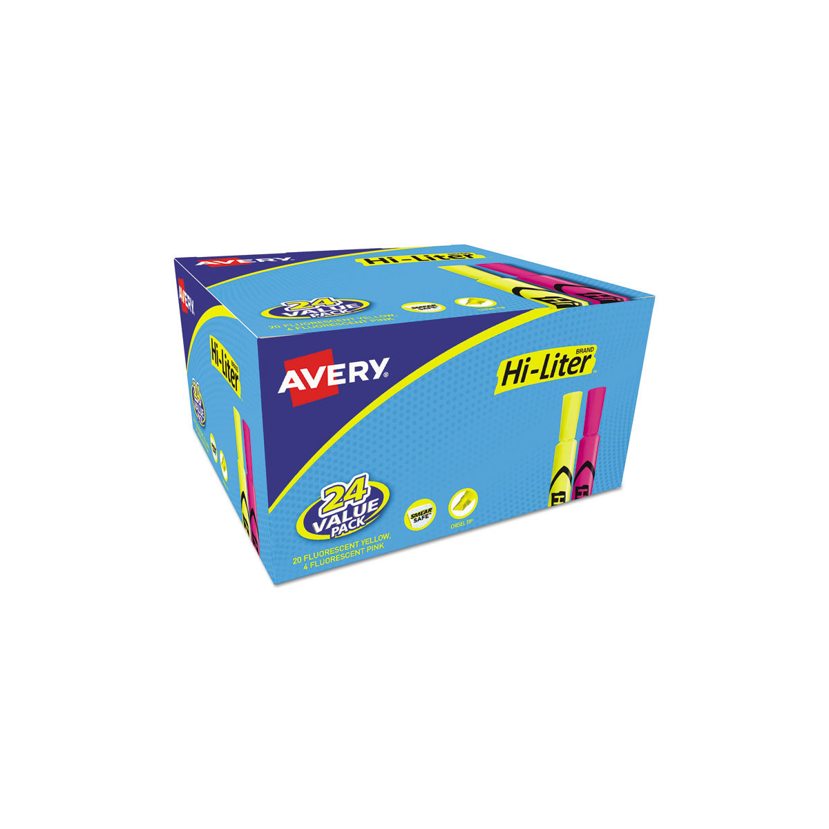 Study research materials, prepare documents or call attention to important information with Avery® HI-LITER Desk-Style Highlighters. Smear Safe, quick-drying ink provides reliable smear protection across most pen, marker and inkjet inks. Durable, fray-proof chisel tip accommodates both highlighting and underlining, while ensuring smooth performance. Nontoxic, low-odor ink is ideal for classrooms, offices and the home.