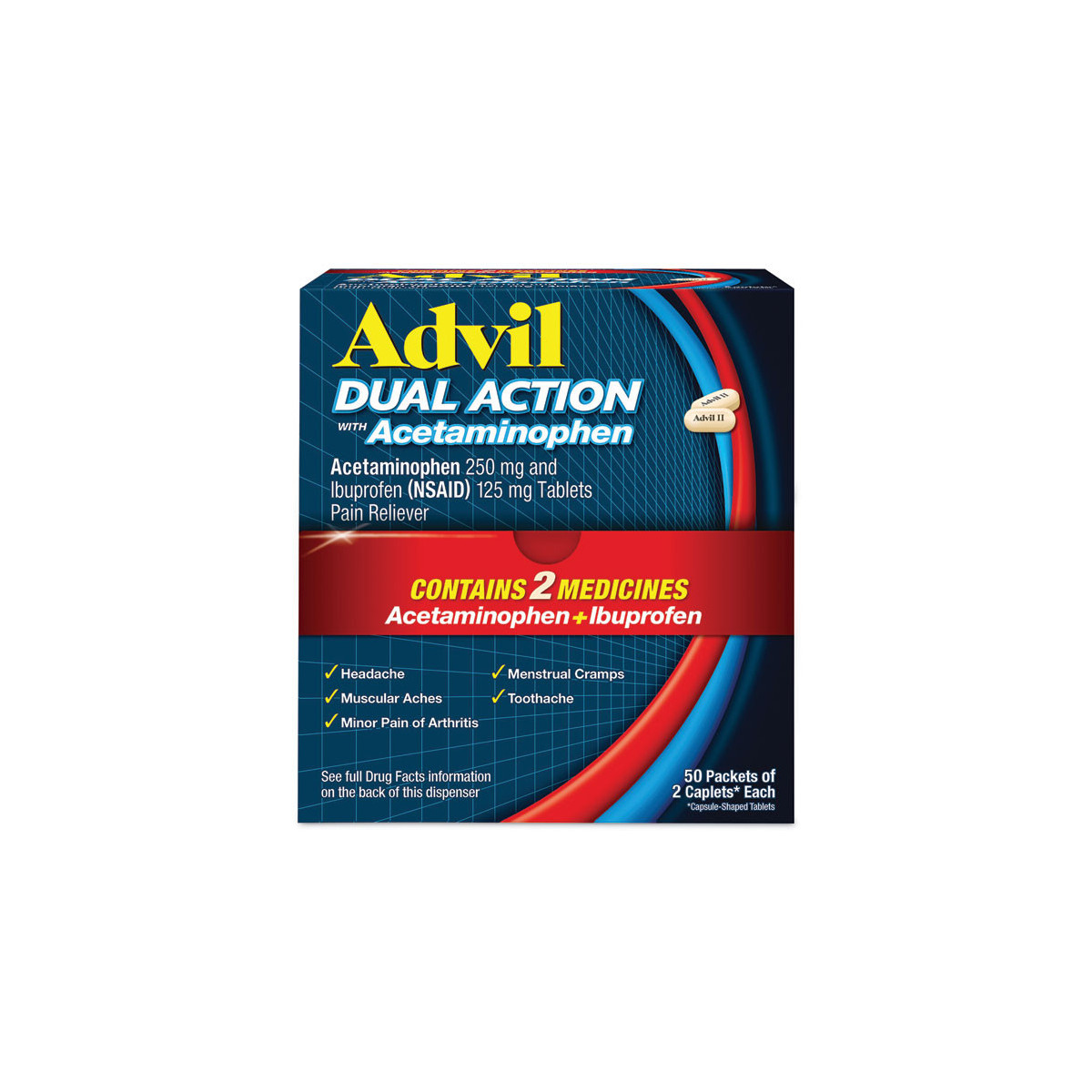 Formulated with 250 mg ibuprofen that targets pain at the source and 500 mg acetaminophen that blocks pain signals in each dose, these coated pills provide relief from a wide variety of aches and pains. Provides headache, toothache, menstrual cramp, muscle pain and lower back pain relief while also relieving minor aches and pains associated with arthritis. The combination of ibuprofen and acetaminophen allows you to take a lower maximum daily dose of each pain medication and still have powerful, eight hour relief.