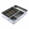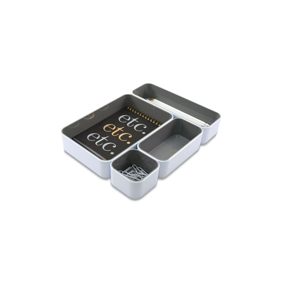 Perfect for organizing drawers, used together or separately. High-gloss, rolled edges provide bold contrast and sleek, modern design. Plastic-infused durability. Versatile in multiple environments such as office, bedroom, and bathroom. White exterior with gray interior. Set includes one 3 x 3 tray, one 3 x 6 tray, one 3 x 9 tray and one 6 x 9 tray.