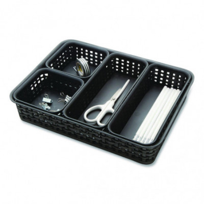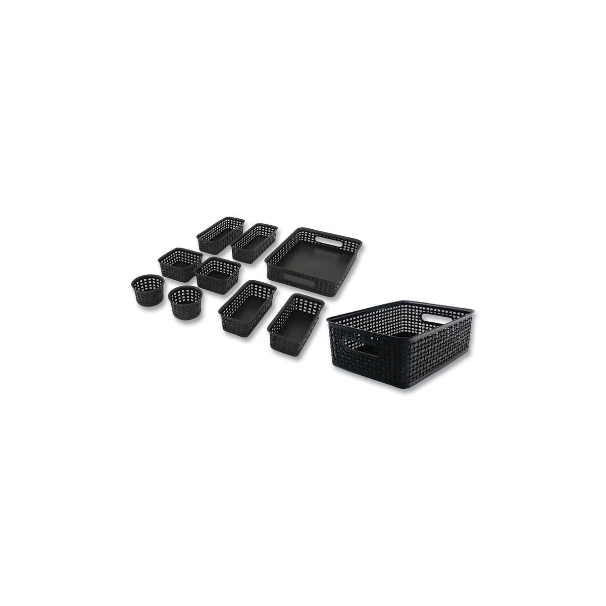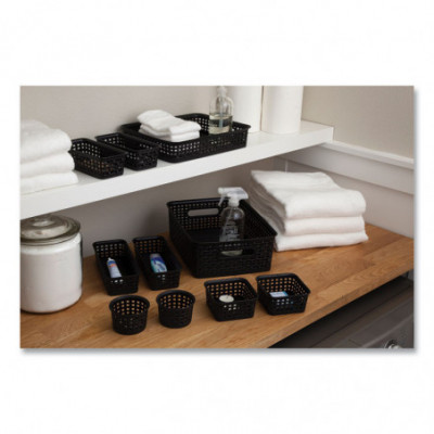 The perfect storage solution and balance of function and fashion, the plastic weave bin declutters any home or office environment. Constructed of sturdy black plastic, this bin can store pretty much anything. The classic black color will blend into any room.