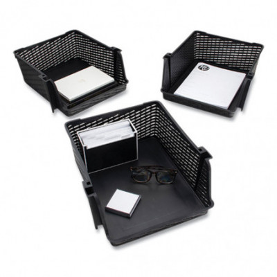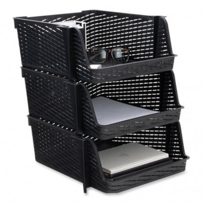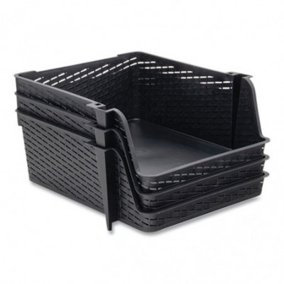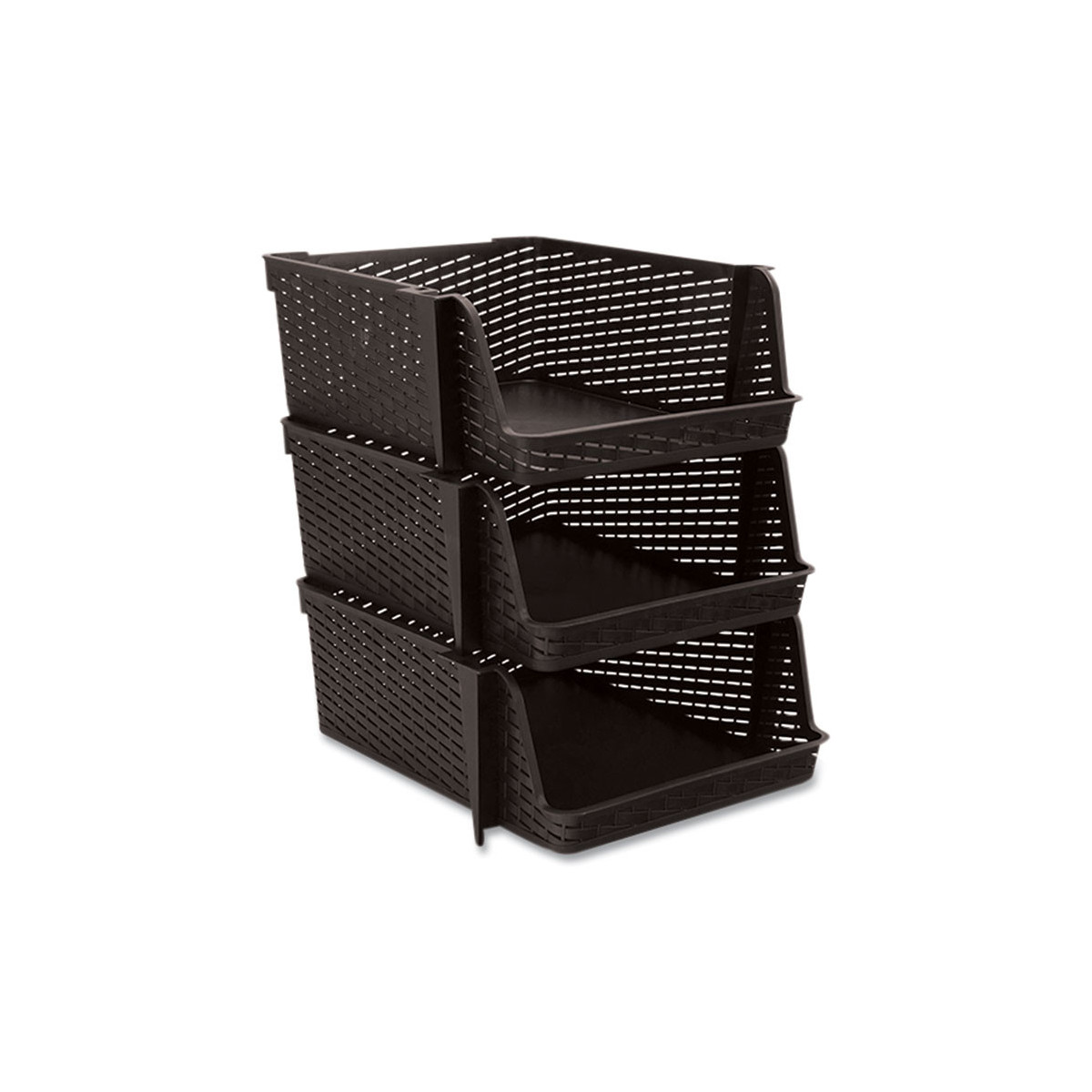 Sort, stack, and organize your clutter with this versatile three-pack of bins. Durable plastic weave bins are designed to give you a great amount of easy-to-access bin space for your ever-changing organizational needs. Perfect for a variety of storage applications such as desktop, paper, closet, pantry, laundry, crafts and more.