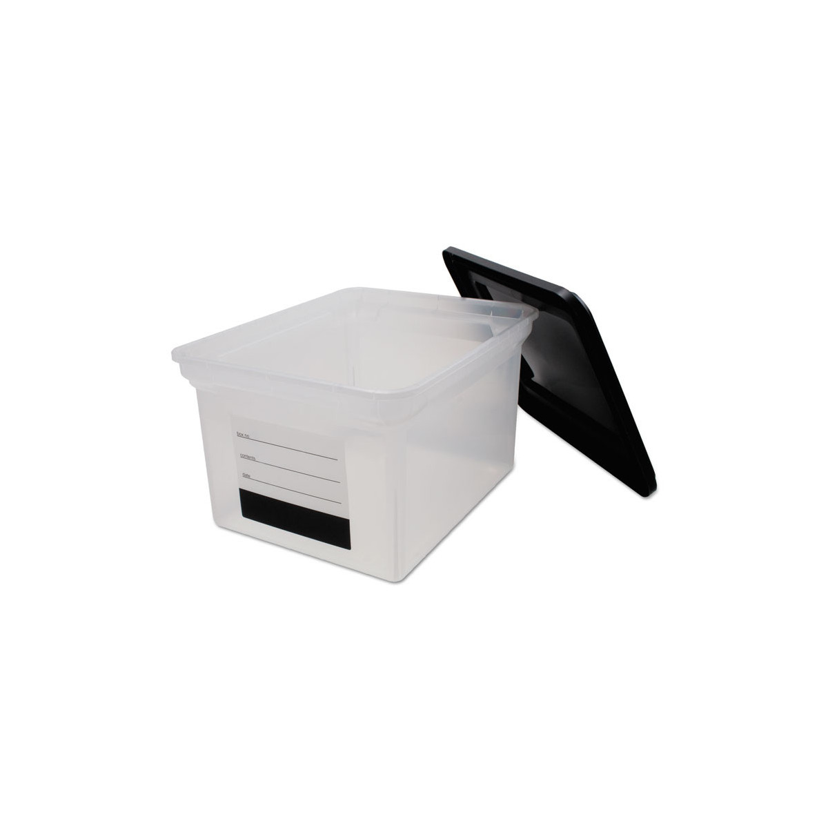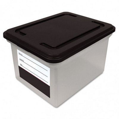 The Advantus File Tote is the classic storage bin for keeping hanging files, paperwork, or just about anything. The container features a simple write-on label, pre-installed for easy identification of contents. The lid snaps on snugly to keep contents free of dust. This file tote can hold standard-size, letter- and legal-sized paper, and hanging files (sold separately). The clear bin also allows for seeing the contents from the side.