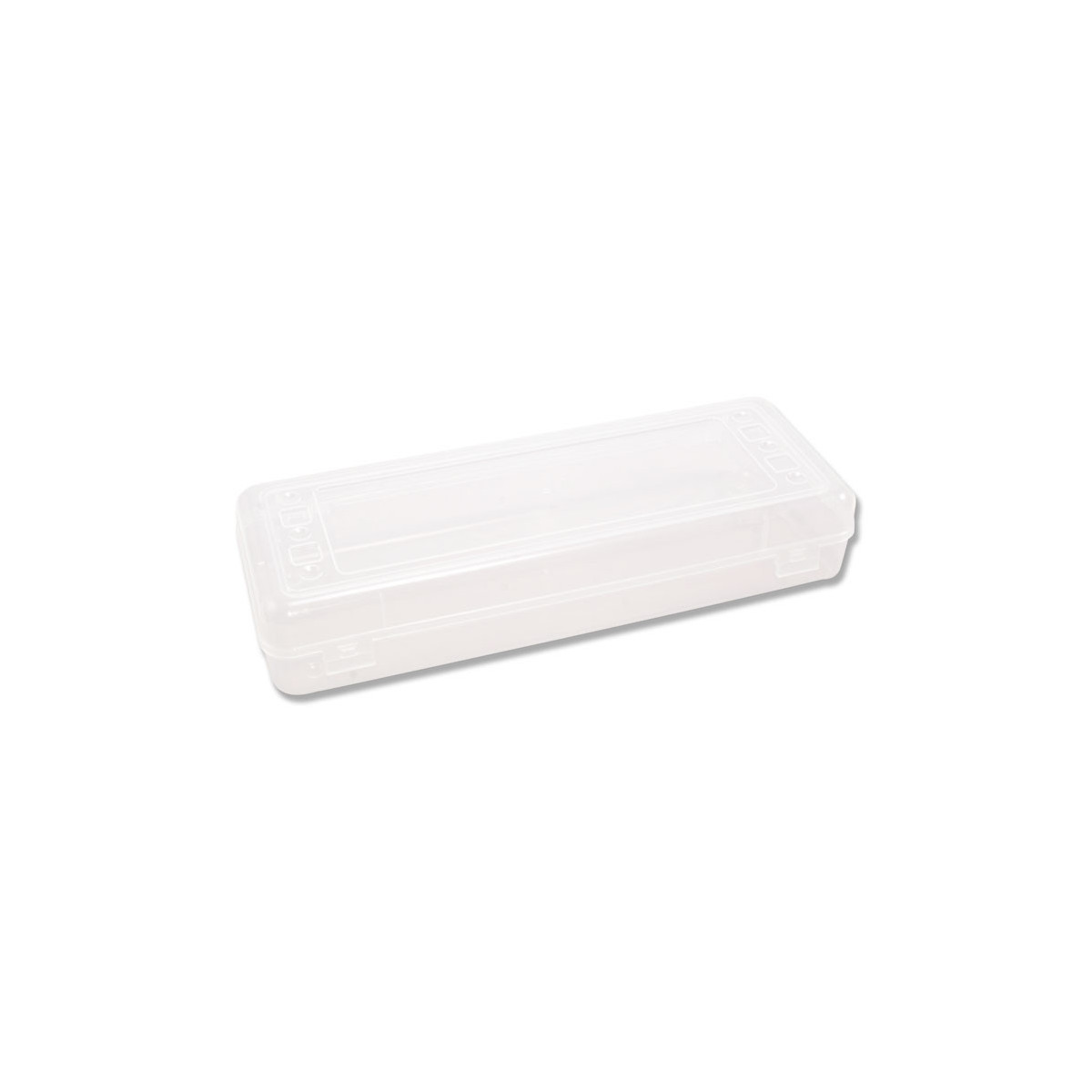 Perfect for storing school or art supplies. Snap-tight lid to keep contents secure. Clear for easy viewing. Durable socket/pin hinges and secure double clasp design. Fits in backpacks for easy carrying. Stretch design allows for storing long items such as rulers and paintbrushes.