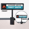 Identify your cubicle with this customized sign. Adjustable base. Sign is double-sided. Overall height of sign and base adjusts from 6.5 to 8 inches. Patent pending.