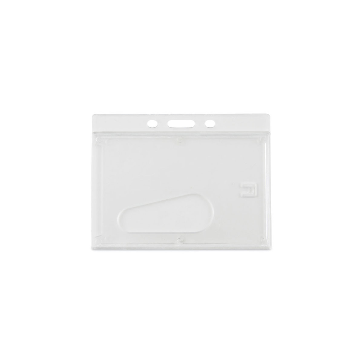 Clear, rigid, molded plastic delivers durability and style. Holds two standard thickness ID or credit cards and features a thumb notch for easy card removal. Slot and pin holes accommodate lanyards, straps and chains.