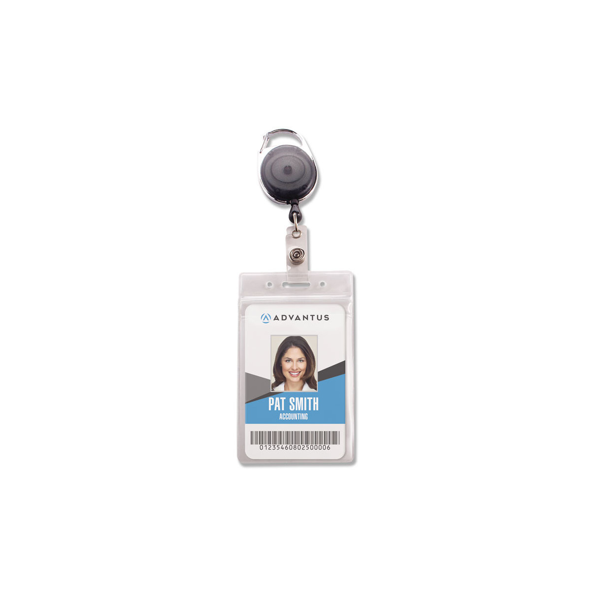 Durable vinyl construction and a seal-top closure keeps your security badge fully enclosed on all sides to protect it from water, oil, grease, soil, dust and more. Fully transparent face keeps your ID visible. Die-cut slot and two pre-punched circular holes accommodate lanyards, chains, clips and badge reels (sold separately unless otherwise noted).