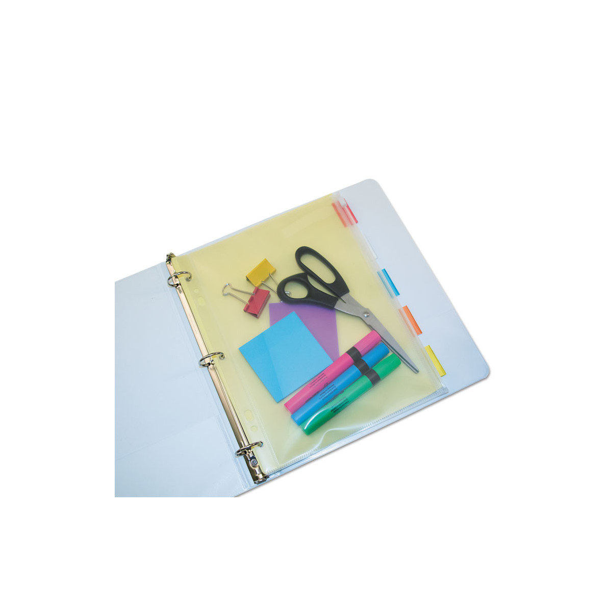 The binder pocket will safely secure your desk supplies! Keep writing instruments, paper clips and various loose items neatly contained and close by. Features heavy, clear matte polypropylene body with a plastic snag-proof zipper pull. Hole-punches allow use in various size binders. Heat sealed edges ensure contents remain secure.