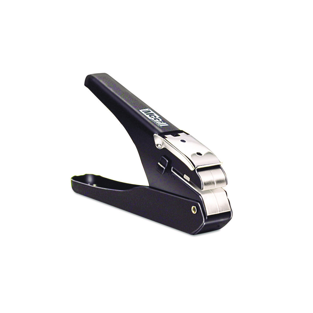 Perfect for ID systems, security badges and name badges. Punches a single horizontal hole. Works on plastic, leather, card stock, credit cards, laminates and paper. Adjustable 1/8" - 5/8" throat reach.