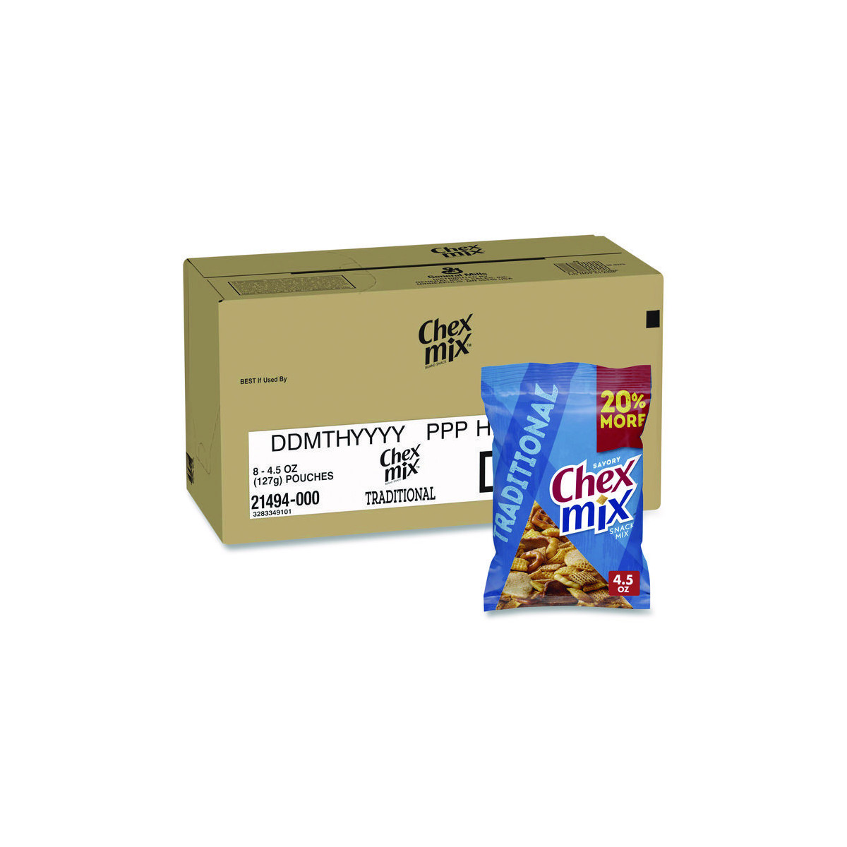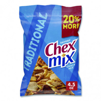 The original Chex Mix you love! It's corn Chex, wheat Chex, pretzels, rye chips, bagel chips and mini breadsticks combined with a unique seasoning blend for a one-of-a-kind snack. Makes a great snack for in the office or on the go. Individually wrapped bags.