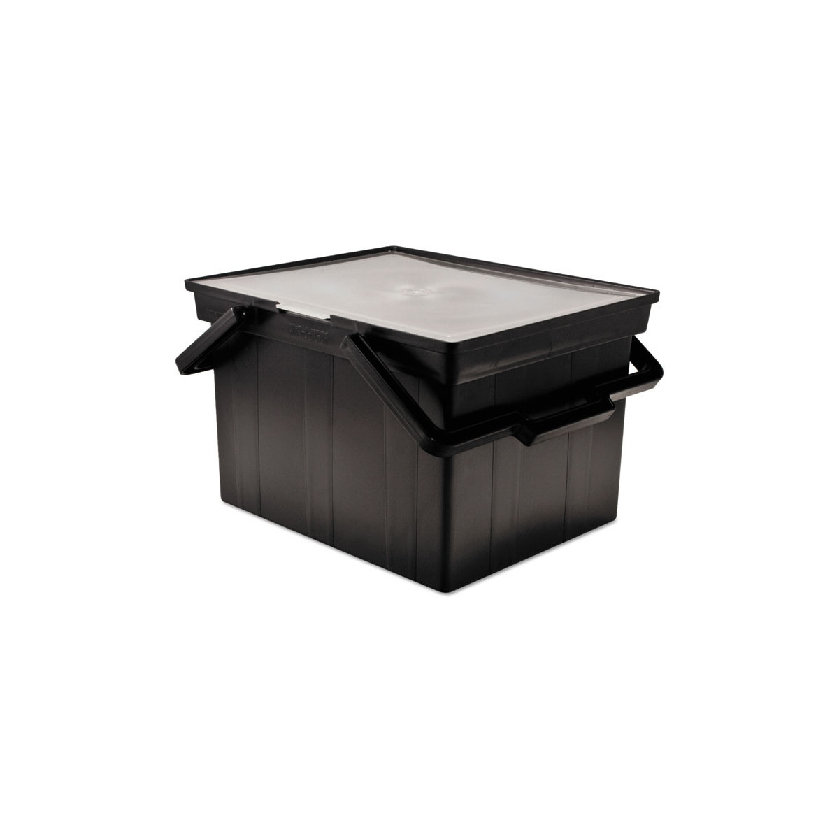 Industrial grade plastic portable file holder with see-through, hinged lid. Includes easy-lift handles and built-in tracks for letter or legal size hanging file folders (sold separately). Use file alone or set inside Heavy-Duty File Shuttle (AVT-FS-2BHD, sold separately) for easy mobility. 40-lb. capacity.