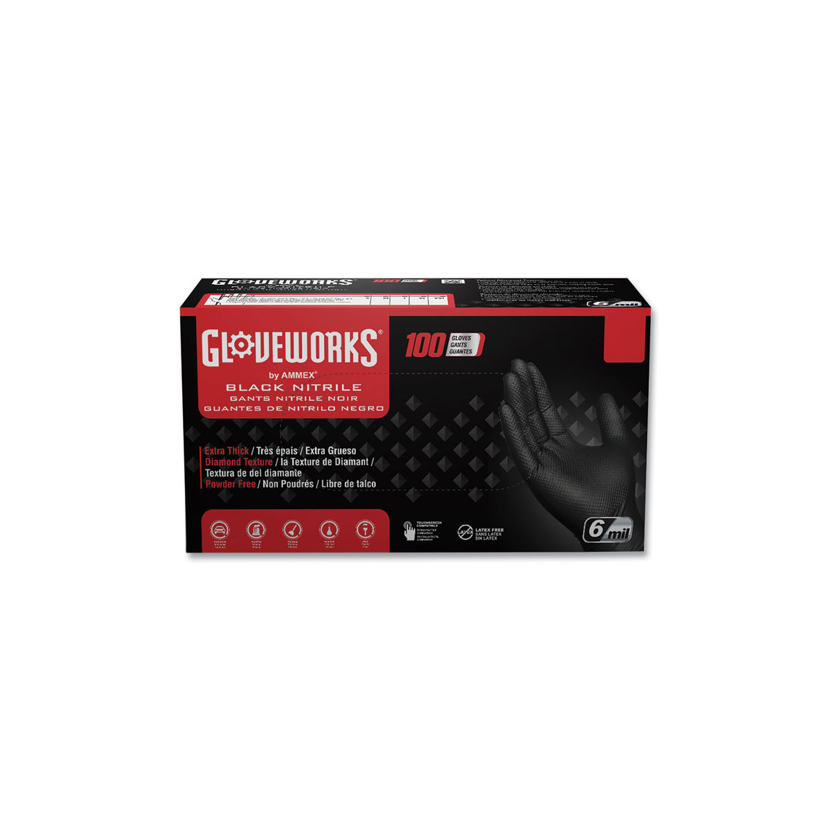 Gloveworks by AMMEX Heavy-Duty Industrial Nitrile Gloves stand up to the toughest jobs. They feature Raised Diamond Texture (RDT) which creates 60% more surface area for an exceptional liquid channeling grip. RDT provides a comfortable fit: fewer contact points with the skin increase airflow and reduce sweating vs. non-textured gloves.