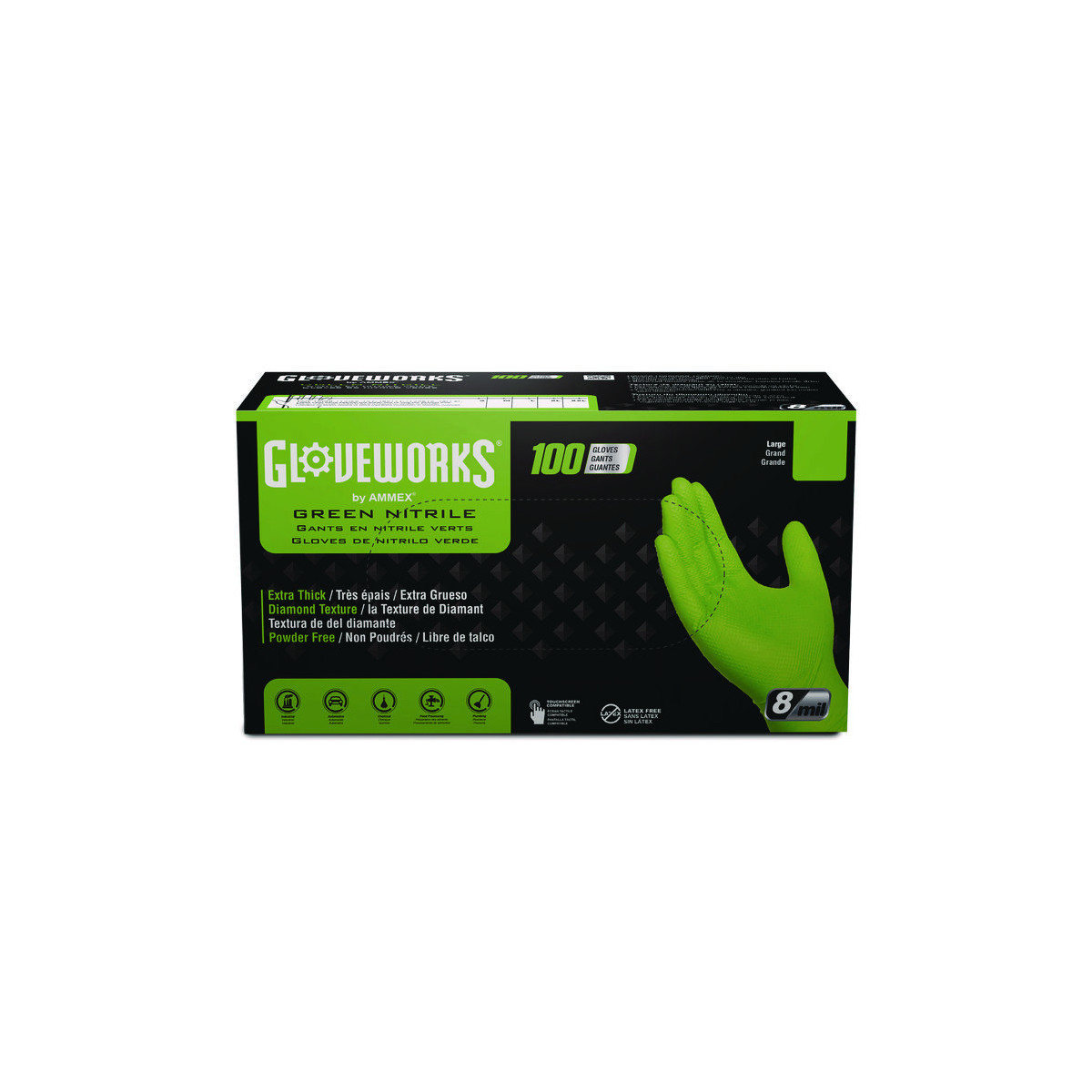 Gloveworks by AMMEX Heavy-Duty Industrial Nitrile Gloves stand up to the toughest jobs. They feature Raised Diamond Texture (RDT) which creates 60% more surface area for an exceptional liquid channeling grip. RDT provides a comfortable fit: fewer contact points with the skin increase airflow and reduce sweating vs. non-textured gloves.