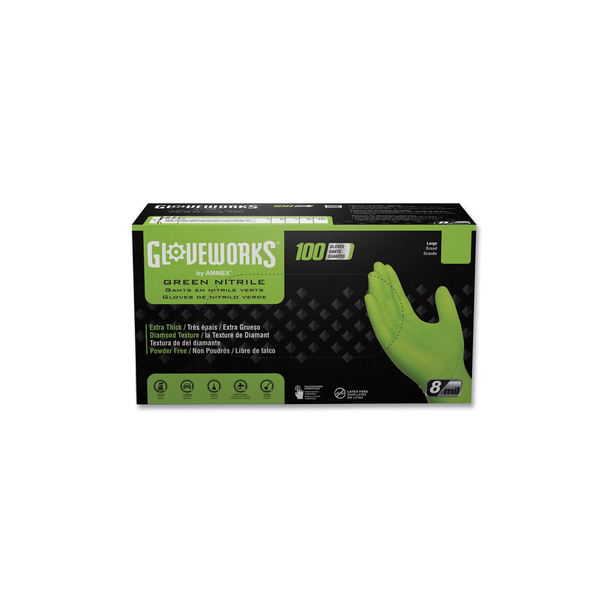 Gloveworks by AMMEX Heavy-Duty Industrial Nitrile Gloves stand up to the toughest jobs. They feature Raised Diamond Texture (RDT) which creates 60% more surface area for an exceptional liquid channeling grip. RDT provides a comfortable fit: fewer contact points with the skin increase airflow and reduce sweating vs. non-textured gloves.