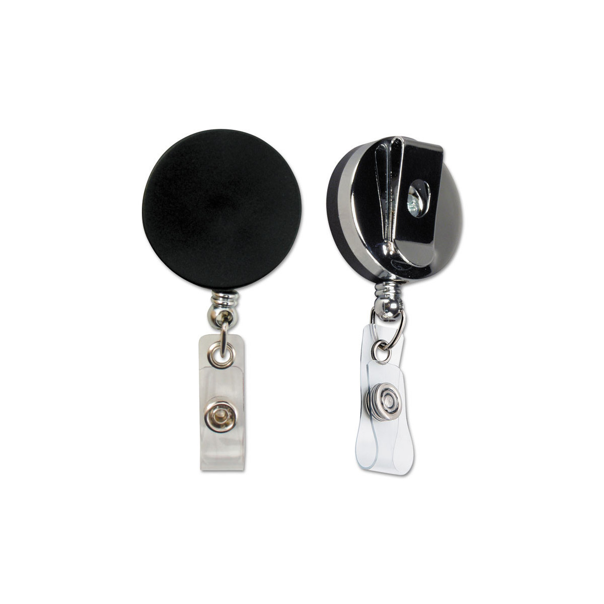 Durable, metal-and-plastic round card reel is convenient for displaying your ID or security badge. Heavy duty reel with slide-style clip attaches easily to a belt, pocket or purse, ensuring that your ID card stays securely on your person at all times. Extends 30 inches when needed and retracts automatically for ease of use.
