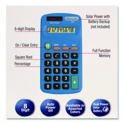 Solar power with AA battery backup (battery not included), helps make sure that the calculator will function even in a dim place when the battery is installed. Durable plastic keys allow for constant use without wear and tear. Suitable for your business travel use. This easy-to-use calculator takes up little space on your desktop and fits into your briefcase or desk drawer. Great for home, office and on the go. Performs common math as well as various financial functions. Perfect for both business and students.