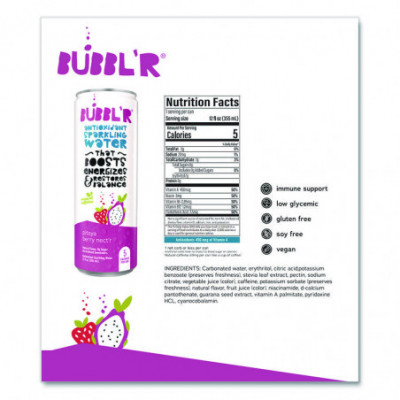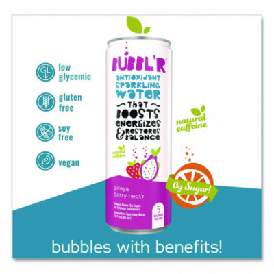 Bubbl'r Antioxidant uses natural flavors, colors, and caffeine sources to give consumers a bubbly burst of energy without any drawbacks of traditional caffeinated soda. With zero grams of sugar and no artificial sweeteners, Bubbl'r Antioxidant is the perfect drink for those looking for a soy-free, gluten-free, or low-glycemic option. Sure, the sparkling personality will make you fall in love at first sip, but then the real magic happens. Fruity effervescence and awesome antioxidants swoop in to balance the body and focus the mind, right before a boost of natural caffeine shows up to save your day.