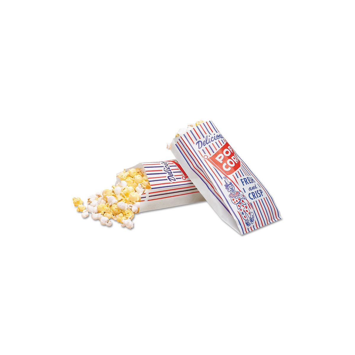 Pinch-Bottom Paper Popcorn Bag, Delicious Popcorn: Circus Clown Icon Labeling, 4" x 1.5" x 8", Red/White/Blue, 1,000/Carton