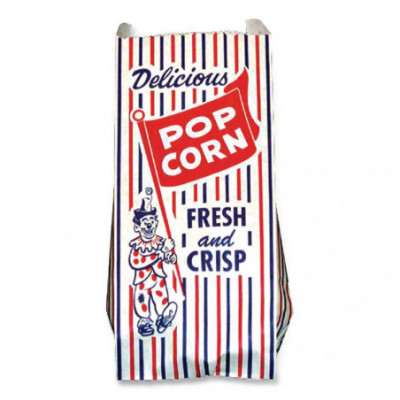 Keep foodservice fun and fresh with classic-looking, striped popcorn bags. Blue-and-red striping with a fun illustration makes bags an ideal choice for use at fairs and outdoor events. Convenient pinch-bottom bags make an easy quick-service option. Popcorn bags make an economical alternative to cartons and tubs.