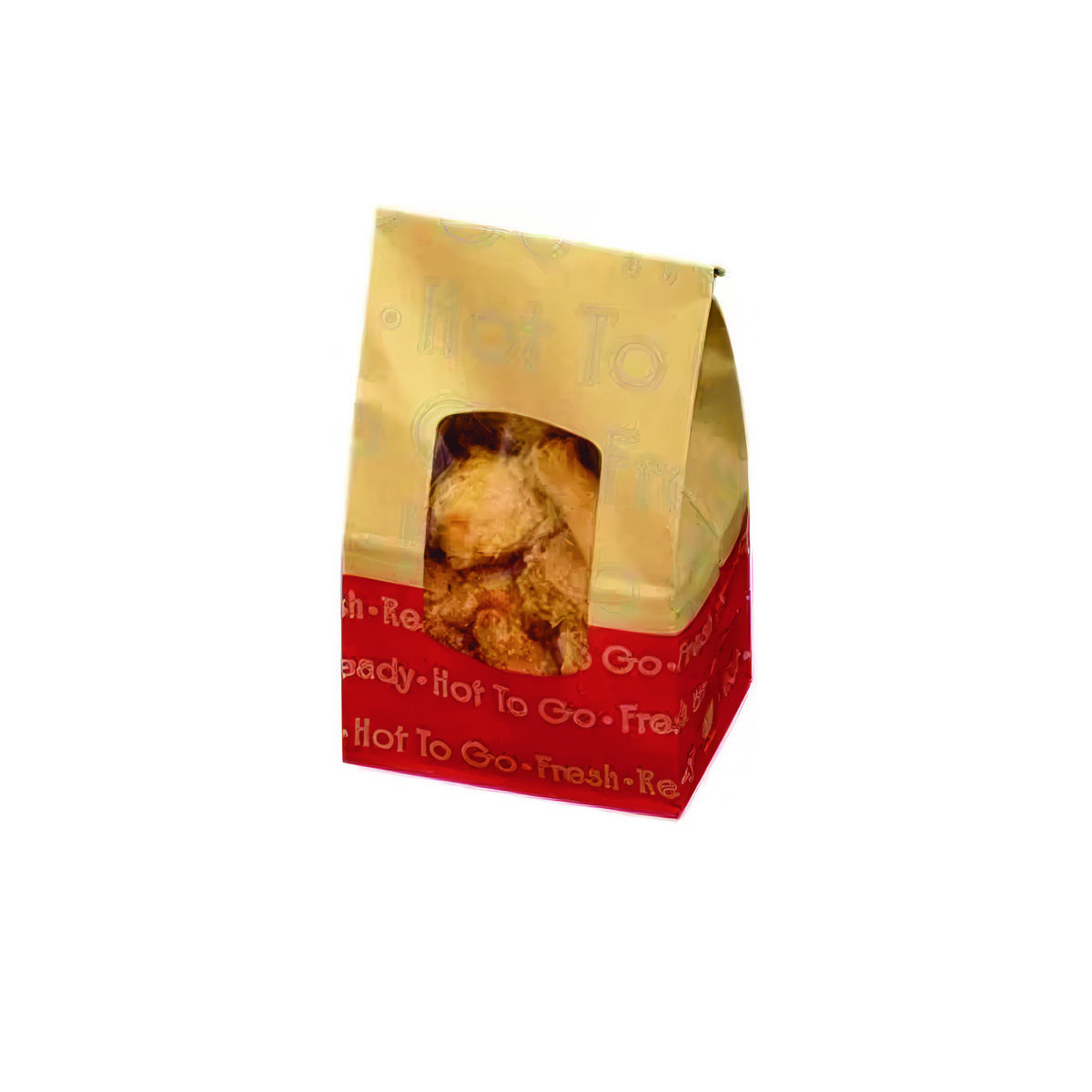 Deli bags maintain food safe temperature in a heated display. Anti-fog window remains clear for hours. Grease-resistant, vented bag keeps fried foods crispy. Eye-catching window helps increase impulse sales. Easy to carry.