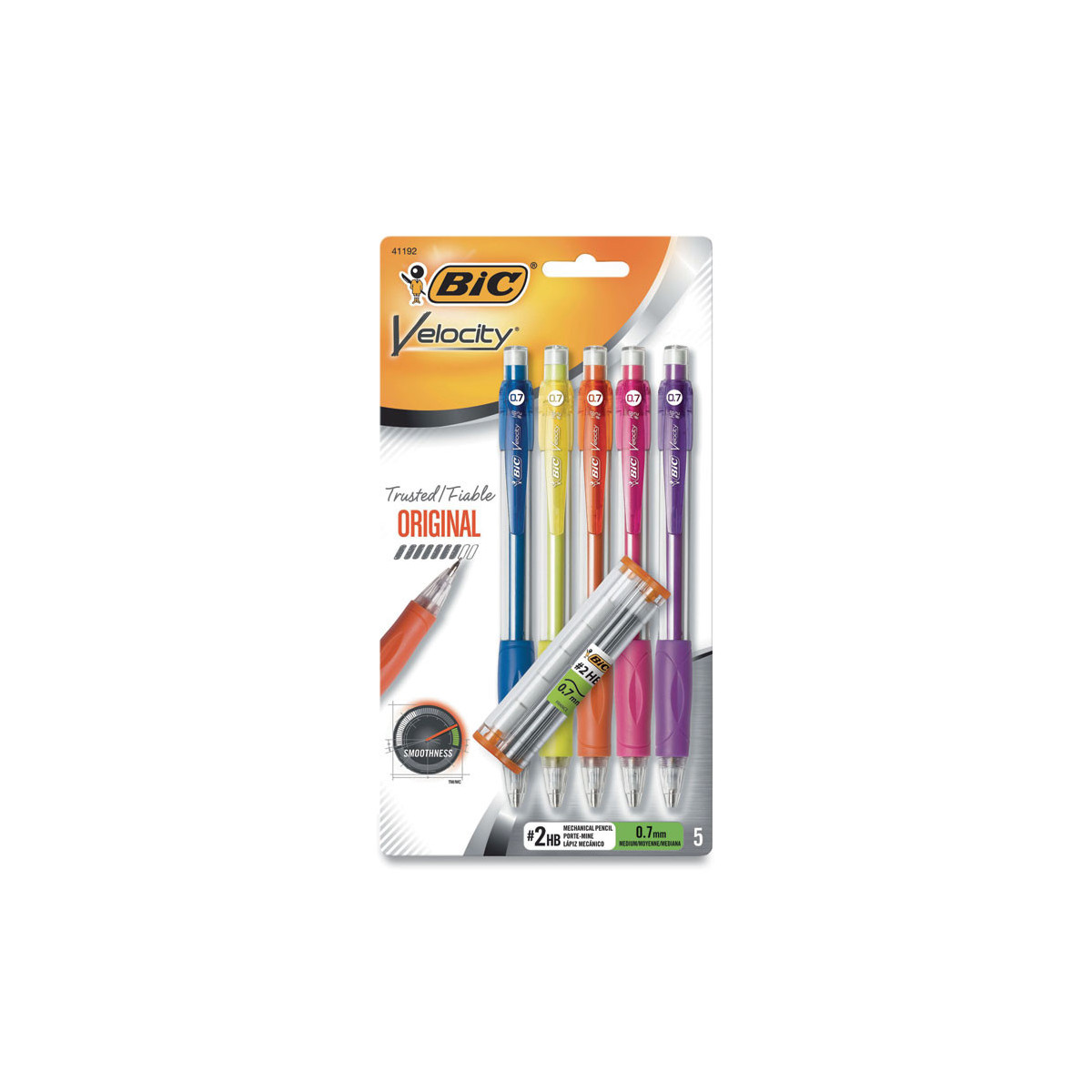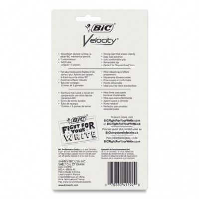 The BIC Velocity Original Mechanical Pencil offers smooth, dark writing that erases cleanly. This pencil comes with strong #2 lead that creates strikingly dark marks, perfect for standardized tests, and a soft grip that provides writing comfort and control. Outfitted with a durable eraser, these versatile pencils help you keep your tests, notes, and compositions tidy. Each pencil comes preloaded with three strong #2 leads and is refillable.