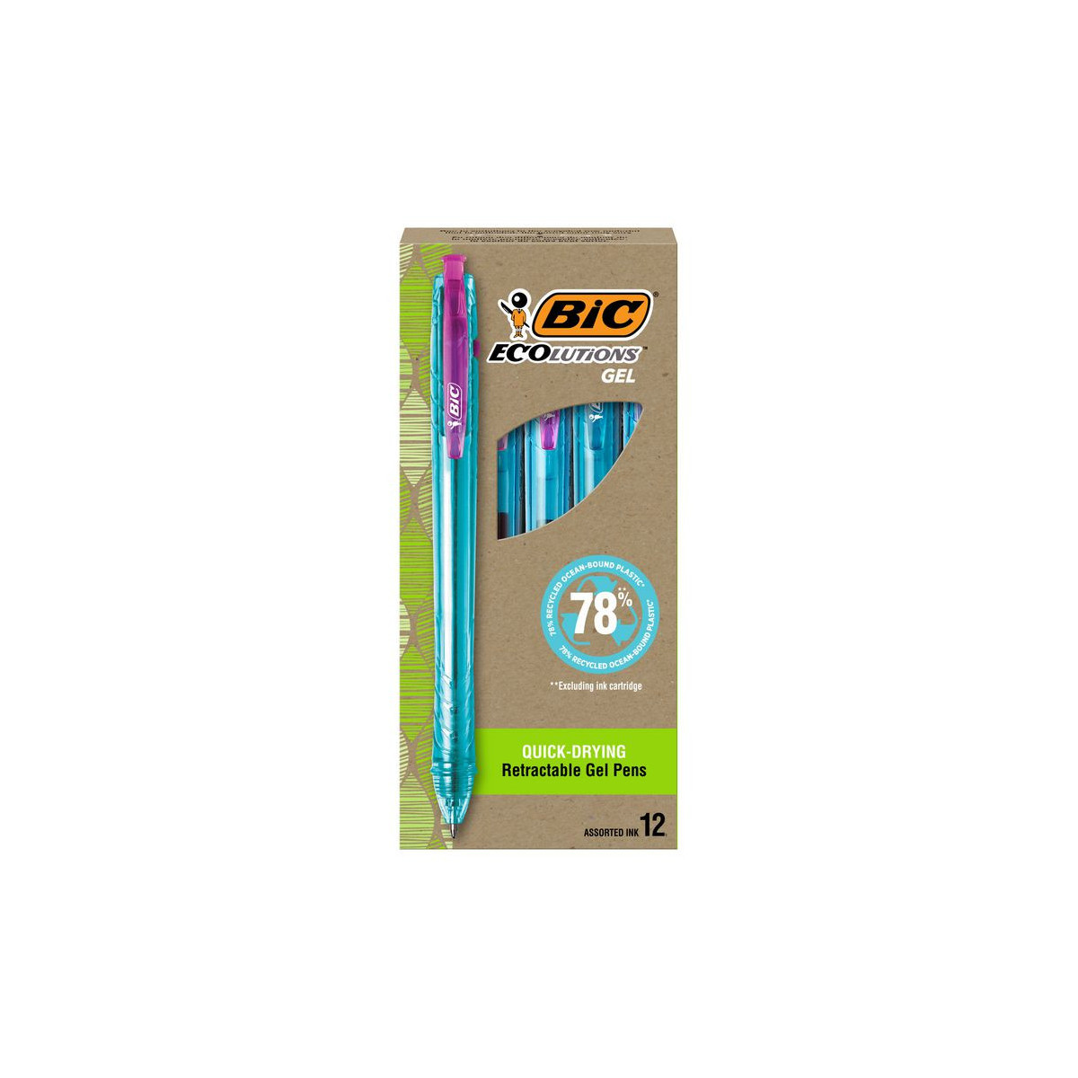 Help write our planet's future with the long-lasting BIC ECOlutions ocean-bound plastic retractable gel pen. This gel pen is made from 78% ocean-bound recycled plastic, excluding the ink cartridge, and the paperboard packaging is made from 100% recycled content and is recyclable. All the materials used are collected within 31 miles of a shore or waterway that leads to the ocean, preventing them from entering the ocean. With a medium 1 mm point, this is the perfect BIC pen for everyday writing. The smooth writing ink system delivers hours of effortless writing. The classic, slender, semi-clear barrel makes it easy to check ink levels. This pen is a smart choice for righties and lefties, as the vibrant ink dries quickly to prevent smearing. Designed for convenience, this retractable pen lets you start writing with just one click. Pick up the BIC ECOlutions ocean-bound plastic retractable gel pen for a high-quality, affordable writing utensil you can trust.