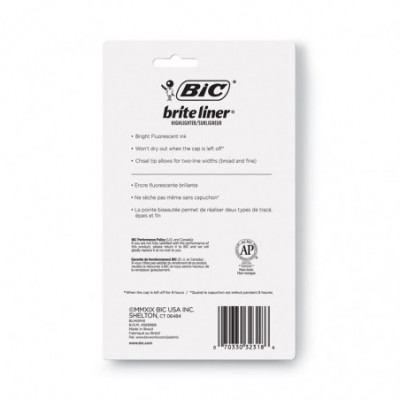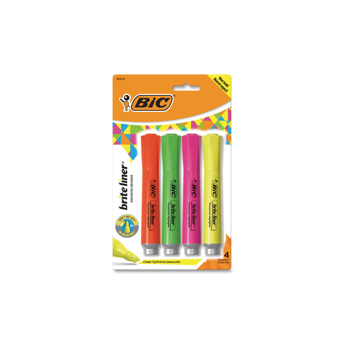 Whether you're organizing notes or underlining passages in a textbook, BIC Brite Liner Highlighters make highlighting a breeze. These tank-style highlighters deliver super-bright fluorescent ink to help emphasize the important parts of documents, books, and notes. Each highlighter creates marks that stand out on the page, and its chisel tip allows for smooth transitioning between precise underlines and broad coverage sweeps. Built with heavy use in mind, Each ACMI-approved, non-toxic highlighter contains a large supply of ink and won't dry out for up to eight hours If left uncapped. BIC Brite Liner Highlighters make highlighting fun and are great for use at home, school, or the office.