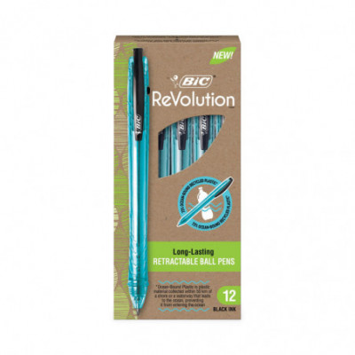 Retractable BIC ReVolution Ocean Bound ballpoint pen features a barrel made of ocean-bound recycled plastic. Packaging is also made entirely of recycled materials. This long-lasting, smooth writing pen is suited for many uses, from jotting down notes to drawing in the margins of your notebook. Once you run out of ink, no need to throw the pen away! Ink refills are available to extend this pen's life. Join the BIC ReVolution and help write our future together.