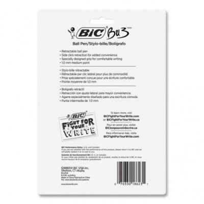 BIC BU3 Grip Retractable Ball Pens deliver functionality and style. Equipped with a side-click retraction mechanism for added convenience, these pens allow you to easily extend and retract the writing point with a simple click. Each pen has a 1.0mm medium ball point that is versatile enough to handle a variety of writing applications. The sleek barrel design offers stylish looks at a great value, and the specially designed grip provides added comfort and control while writing. A great choice for home or the office.