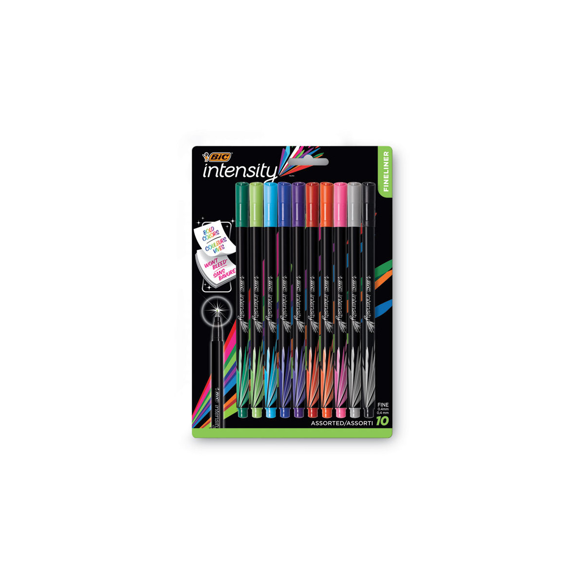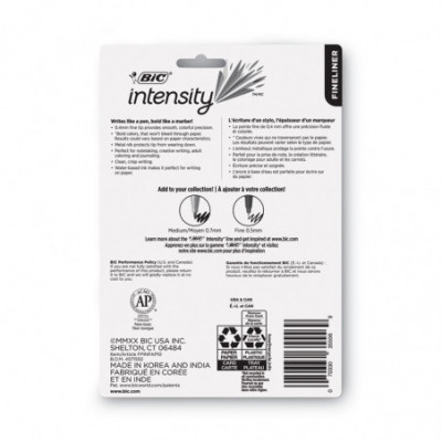 BIC Intensity Fineliner Pro writes like a pen, and is bold like a marker. This pen has bold colors, that won't bleed through paper (results could vary based on paper characteristics). Tip provides smooth, colorful precision. The metal nib protects the tip from wearing down. This pen is perfect for notetaking, creative writing, adult coloring, and journaling. The water-based ink makes it perfect for writing on paper and is AMCI approved non toxic.
