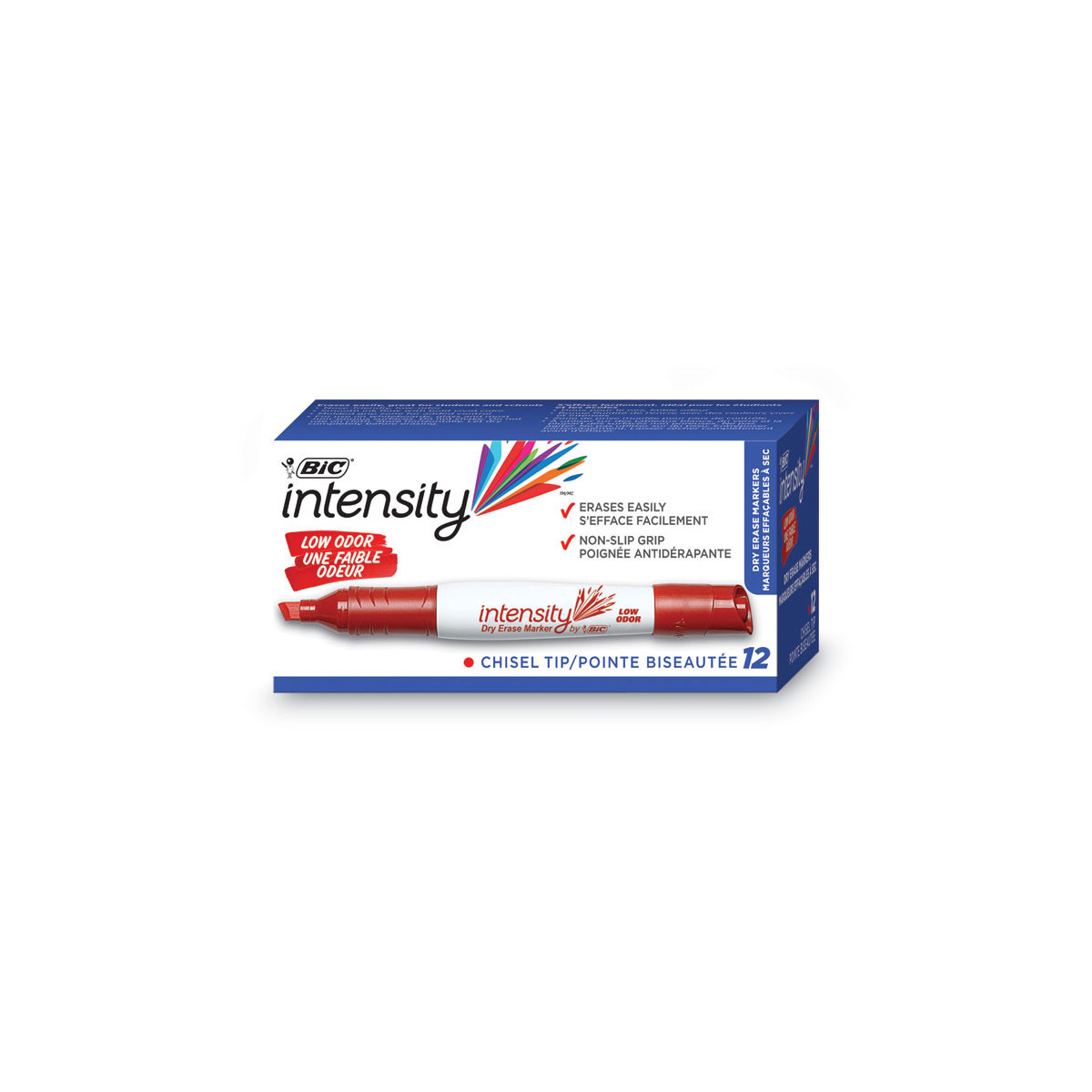 With a molded grip zone and versatile chisel tip, BIC Intensity Low Odor Dry Erase Markers are ideal for school, work and home projects. These ACMI-approved and non-toxic markers provide smooth ink flow and bright, low-odor ink and are suitable for use on dry erase boards, glass and most non-porous surfaces. The chisel tip makes bold, broad lines and the vivid marks easily erase with a cloth, tissue or felt eraser.