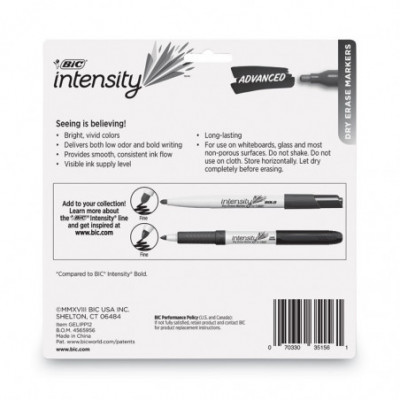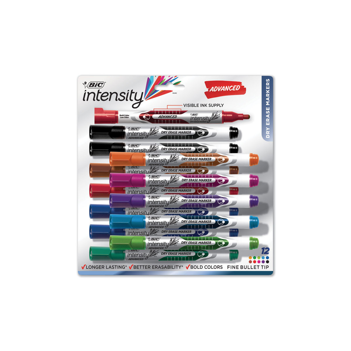 BIC Intensity Advanced Dry Erase Markers deliver both low odor and bold writing. With their long-lasting supply of liquid ink, these markers provide smooth, consistent ink flow on whiteboards, glass, and most non-porous surfaces. These markers also offer a visible ink supply, so you can easily check if you're running low. Marks erase easily with a tissue or cloth. Available in a variety of bright, vivid colors, these dry erase markers are a great choice for home, school, or the office.