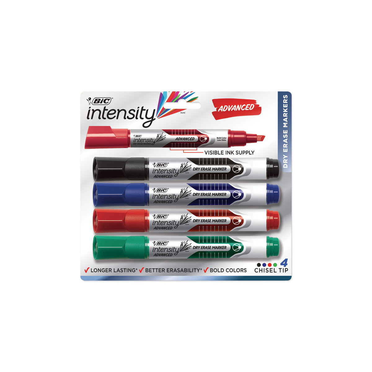 BIC Intensity Advanced Dry Erase Markers deliver both low odor and bold writing. With their long-lasting supply of liquid ink, these markers provide smooth, consistent ink flow on whiteboards, glass, and most non-porous surfaces. These markers also offer a visible ink supply, so you can easily check if you're running low. Marks erase easily with a tissue or cloth. Available in a variety of bright, vivid colors, these dry erase markers are a great choice for home, school, or the office.