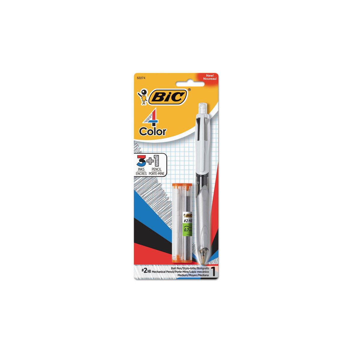 4-Color pen now includes a pencil! BIC 4-Color 3+1 Ball Pen and Pencil helps you have fun expressing your thoughts with three different ink colors—black, blue, and red—plus a 0.7 mm mechanical pencil equipped with #2 HB lead. Great for annotating or organizing your notes, this versatile writing instrument has a retractable design that lets you switch colors with an easy click. Each package includes 12 lead refills and five replacement erasers.