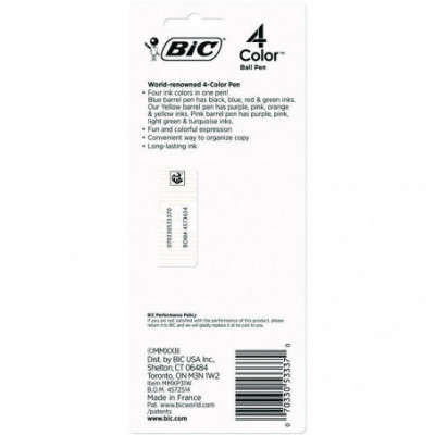 Express yourself in vivid color with the dependable and ultra-convenient BIC® 4-Color Ball Pen. This world-renowned multifunction pen lets you choose from four ink colors with a simple click, so there's no need to carry around multiple pens. It's a practical solution that's ideal for color-coding, organizing notes, editing others' work and more. Standard ballpoint ink is long-lasting, and the pen is refillable.
