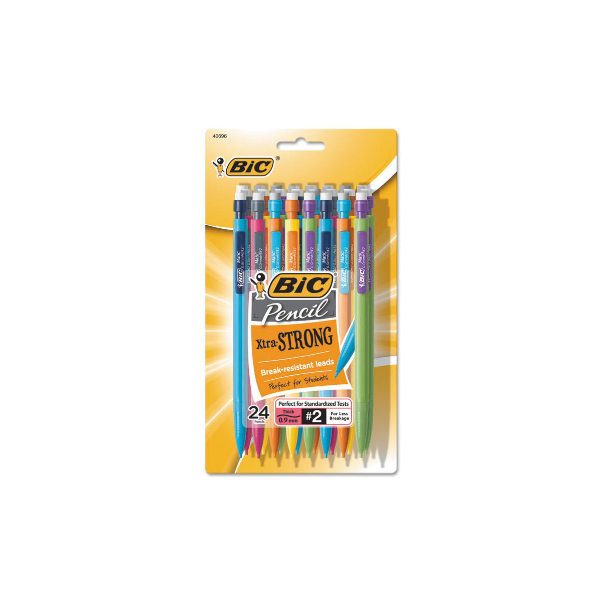 BIC Xtra-Strong Mechanical Pencils are designed to be durable with strong 0.9 mm leads that resist breaking. The thick, smooth-writing #2 lead never requires sharpening and is always ready to write when you are, making this pencil perfect for students and the smart choice at test time. The lead advances quickly and easily with a simple click of the eraser, does not smudge and erases cleanly, helping keep your work looking neat. Students of any age will love the bright colorful barrels and contrasting vibrant clips.