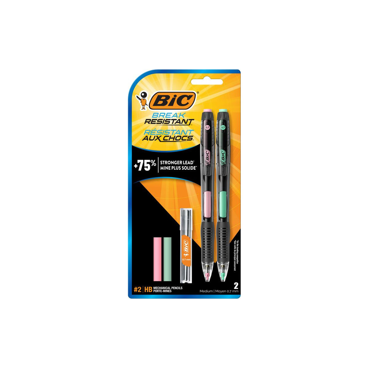 No more broken leads. Enjoy a smooth, uninterrupted writing experience with the BIC Break-Resistant mechanical pencils, thanks to the specially formulated 0.7 mm lead and an innovative shock-absorption mechanism that has a 75% stronger lead. Stronger lead means less breakage-so you can write with less time spent clicking for more lead. Crafted with thoughtful design from top to bottom, the BIC Break-Resistant mechanical pencil is the tool for any type of writing from jotting down a simple shopping list to composing long-form letters, drafting professional documents to taking standardized tests, and everything in between. Avoid the frustration of flimsy lead that snaps easily and requires constant replacement with these pencils that go the distance and last as long as your inspiration. Pencils feature a contoured grip that gives you the comfort you need to enjoy a long or short writing session.
