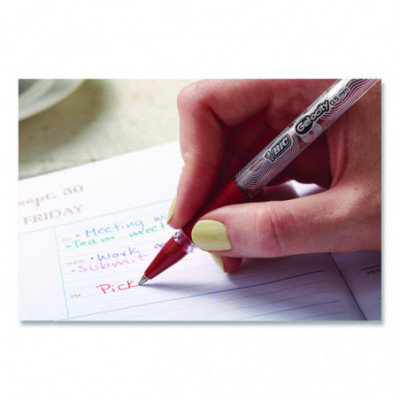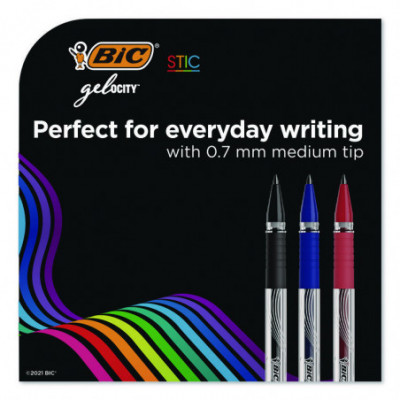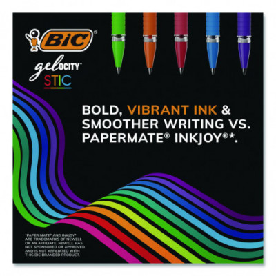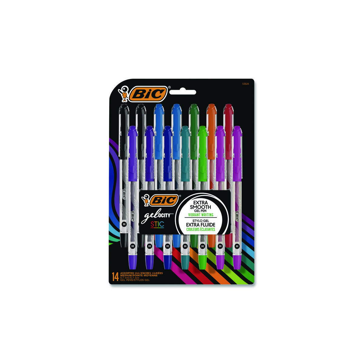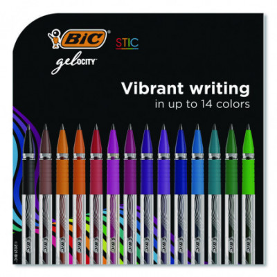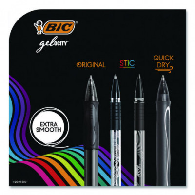 Enjoy a super-smooth writing experience with BIC® Gel-ocity™ STIC Gel Pens. Ideal for note-taking, journaling and a variety of everyday writing activities, these pens feature a unique, smear-free gel ink that dries in as little as five seconds, while their easy-flow system and high-quality points ensure fluid, precise, nearly effortless writing. Their smooth round barrels with rubberized grips rest comfortably in your hand, and their translucent design with ink-color-matched accents make it easy to grab the right color while allowing you to keep an eye on your remaining ink supply. Choose Gel-ocity™ STIC Gel Pens; they're sure to make a striking impression at work, at school and at home.