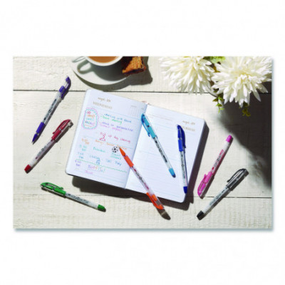 Smear-free gel ink dries in as little as five seconds, while their easy-flow system and high-quality points ensure fluid, precise, nearly effortless writing. Smooth round barrels with rubberized grips rest comfortably in your hand. Translucent with ink-color-matched accents.
