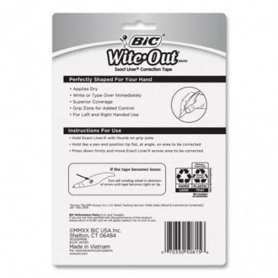 Make fast, easy, and precise corrections with BIC® Wite-Out® Brand Exact Liner Correction Tape. Tear-resistant film-based tape comes in a dispenser with a natural shape that fits your hand and a grip zone for comfort and control. The tear-resistant film-based tape requires no dry time and won't bleed or drip, so you can instantly write or type your corrections over it. For convenience, BIC® Wite-Out® Brand Exact Liner Correction Tape is suitable for left- or right-handed use and has a colorful, translucent body so you can see exactly how much tape remains. A self-winding wheel lets you easily rewind the tape should it become loose.