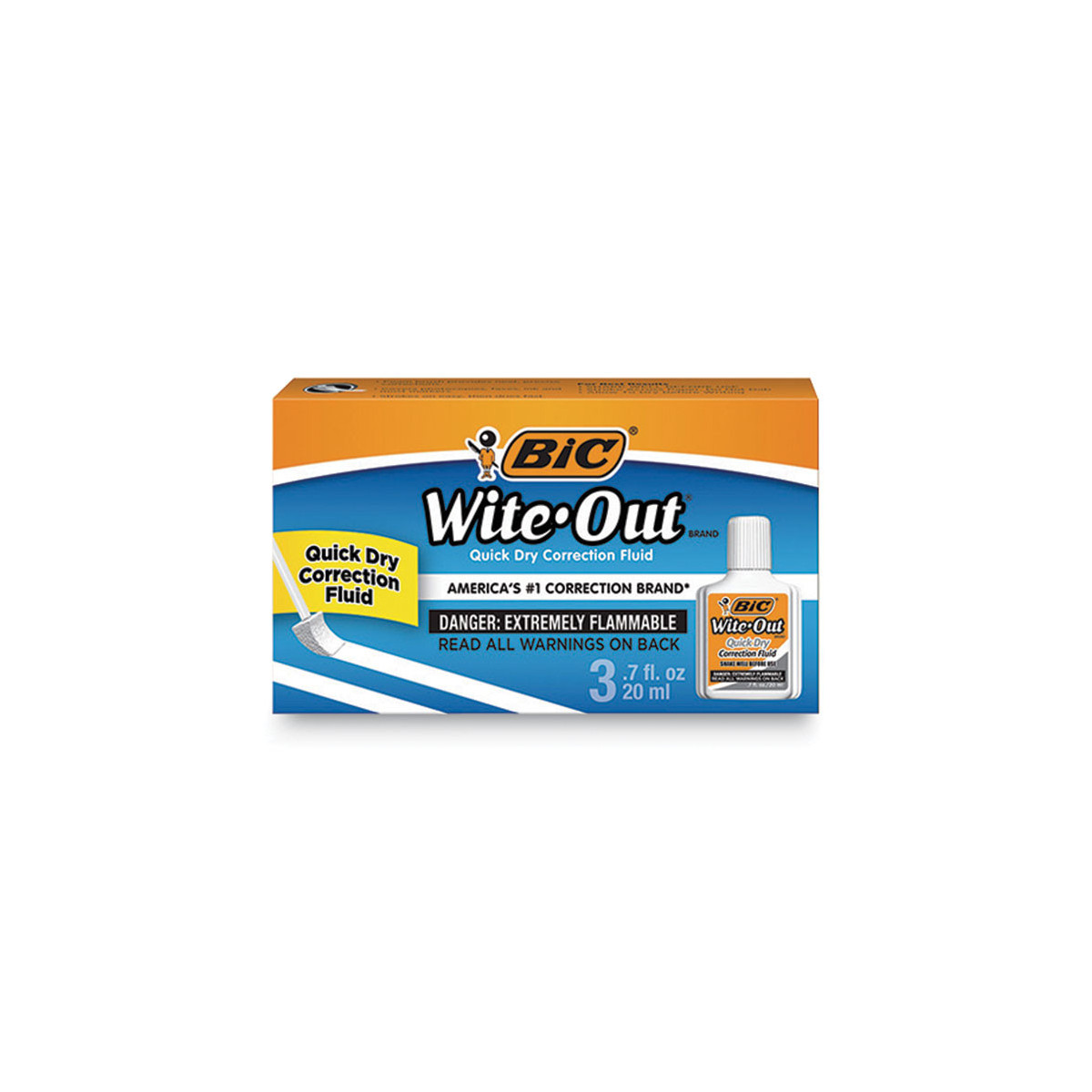Quickly and easily correct errors on your school and work documents with BIC Wite-Out Brand Quick Dry Correction Fluid. Bright white quick-drying correction liquid works on handwritten and printed ink, faxes, and photocopies like whiteout tape and white out pen. The included applicator is easy to use, while the reduced drying time means you don't have to wait to organize or file your documents after making corrections.