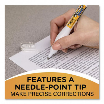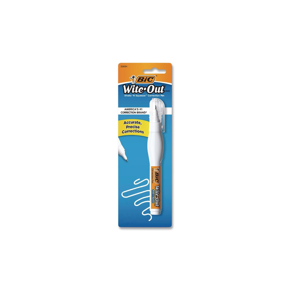 Make precise corrections on even the toughest errors with the BIC Wite-Out Brand Shake 'n Squeeze Correction Pen. Convenient pen features a needle-point tip for accuracy and a soft squeeze barrel for maximum fluid control. The white out liquid, correction fluid offers premium coverage on photocopies, faxes, ink, permanent marker, and more, and it dries quickly to a smooth finish. For best results, shake before using.
