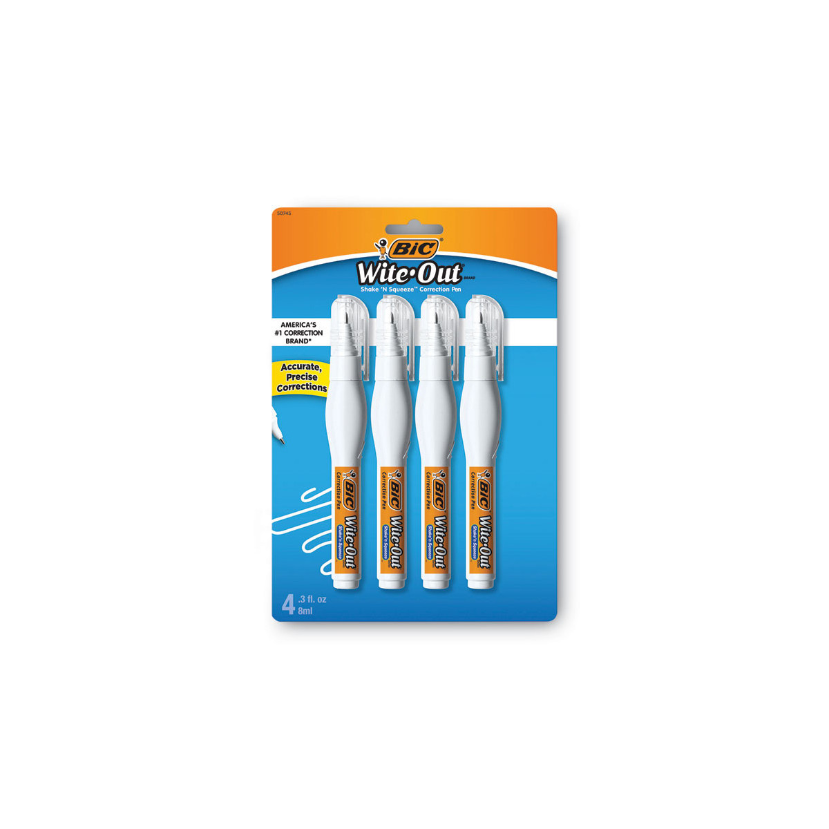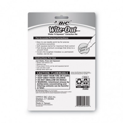 Make precise corrections on even the toughest errors with the BIC Wite-Out Brand Shake 'n Squeeze Correction Pen. Convenient pen features a needle-point tip for accuracy and a soft squeeze barrel for maximum fluid control. The white out liquid, correction fluid offers premium coverage on photocopies, faxes, ink, permanent marker, and more, and it dries quickly to a smooth finish. For best results, shake before using.
